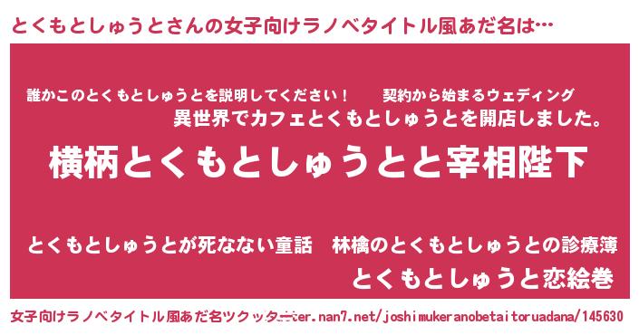 | 男性向けラノベタイトル風あだ名 | 『とくもとしゅうとに滅ぼされるだけの簡単なお仕事です』 |