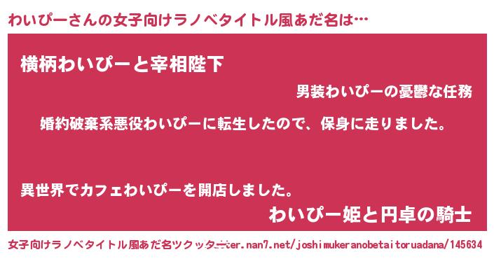 | 男性向けラノベタイトル風あだ名 | 『ワイピースレイヤー』『わいぴーの憂鬱』 |