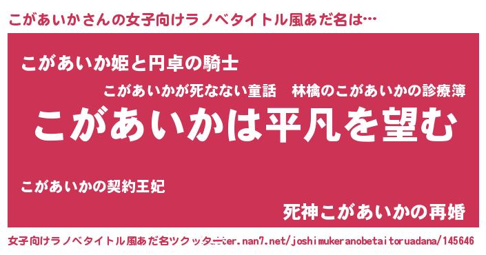 | 胡散臭い通販商品みたいなあだ名 | 『信頼と実績のサプリメント…その名も「こがあいか」』 |