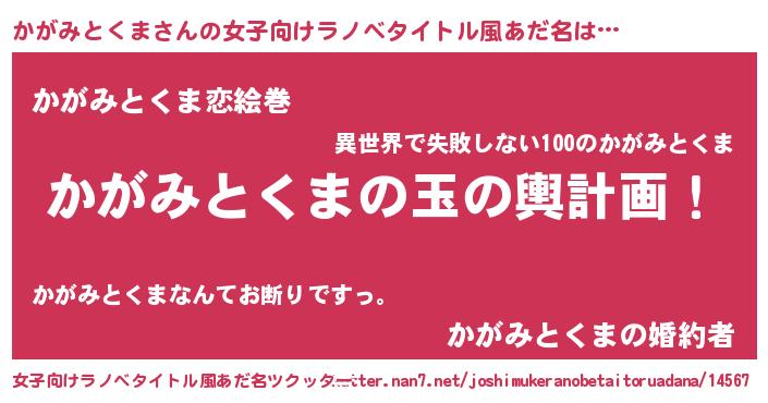 | 男性向けラノベタイトル風あだ名 | 『かがみとくま~年齢イコール彼女いない歴の魔法使い~』 |