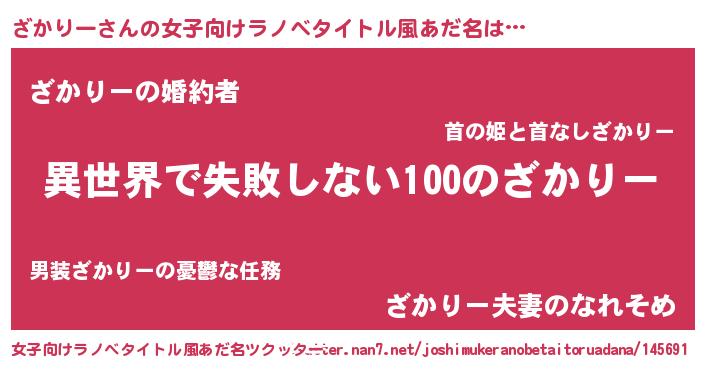 | 男性向けラノベタイトル風あだ名 | 『ざかりーという概念が存在しない退屈な世界 』 |