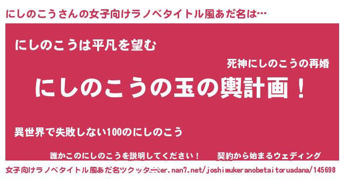 | 男性向けラノベタイトル風あだ名 | 『にしのこう~年齢イコール彼女いない歴の魔法使い~』 |