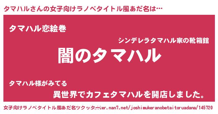 | 男性向けラノベタイトル風あだ名 | 『Re:タマハルから始める異世界生活』 |
