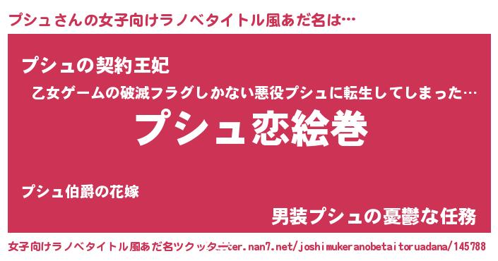 | 男性向けラノベタイトル風あだ名 | 『おまえをオタクにしてやるから、俺をプシュにしてくれ! 』 |
