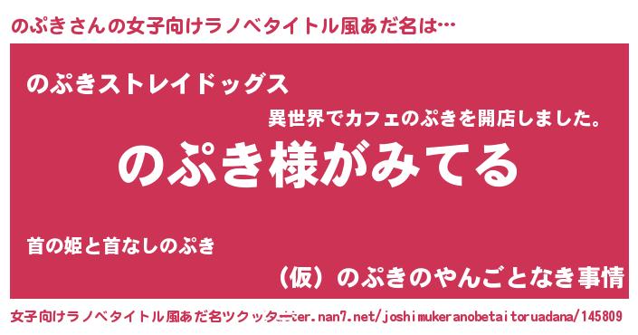| 男性向けラノベタイトル風あだ名 | 『のぷきの嫁は女の子じゃないと思った?』 |