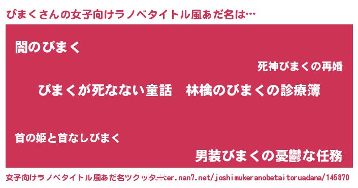 びまくさんの女子向けラノベタイトル風あだ名は… 『びまくが死なない童話 林檎のびまくの診療簿』『闇のびまく』『男装びまくの憂鬱な任務』 ツクッター #女子向けラノベタイトル風あだ名ツクッター http://tkutter.nan7.net/joshimukeranobetaitoruadana/145870/