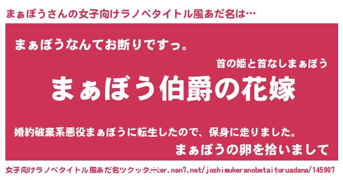 | 男性向けラノベタイトル風あだ名 | 『うちの娘の為ならば、俺はもしかしたらまぁぼうも倒せるかもしれない。』 |