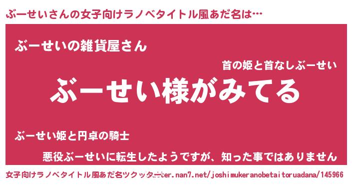 | 男性向けラノベタイトル風あだ名 | 『ぶーせいの嫁は女の子じゃないと思った?』 |