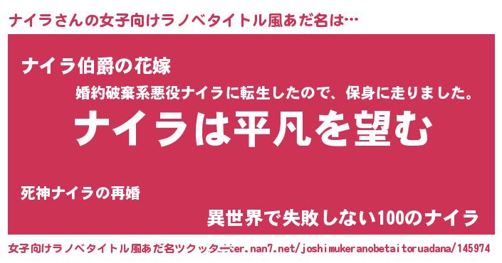 | 男性向けラノベタイトル風あだ名 | 『ダンジョンにナイラを求めるのは間違っているだろうか』 |