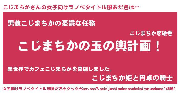 こじまちかさんの女子向けラノベタイトル風あだ名は… 『こじまちかの玉の輿計画!』『男装こじまちかの憂鬱な任務』『こじまちか姫と円卓の騎士』 ツクッター #女子向けラノベタイトル風あだ名ツクッター http://tkutter.nan7.net/joshimukeranobetaitoruadana/145981/