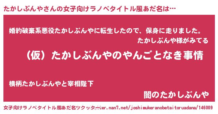 | 男性向けラノベタイトル風あだ名 | 『たかしぶんやの憂鬱』 |