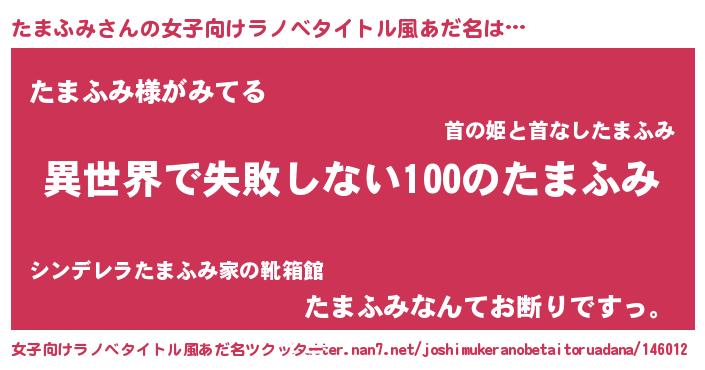 たまふみさんの女子向けラノベタイトル風あだ名は… 『異世界で失敗しない100のたまふみ』『たまふみ様がみてる』『たまふみなんてお断りですっ。』 ツクッター #女子向けラノベタイトル風あだ名ツクッター http://tkutter.nan7.net/joshimukeranobetaitoruadana/146012/