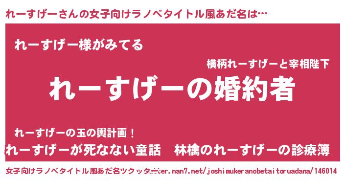 れーすげーさんの女子向けラノベタイトル風あだ名は… 『れーすげーの婚約者』『れーすげー様がみてる』『れーすげーが死なない童話 林檎のれーすげーの診療簿』 ツクッター #女子向けラノベタイトル風あだ名ツクッター http://tkutter.nan7.net/joshimukeranobetaitoruadana/146014/