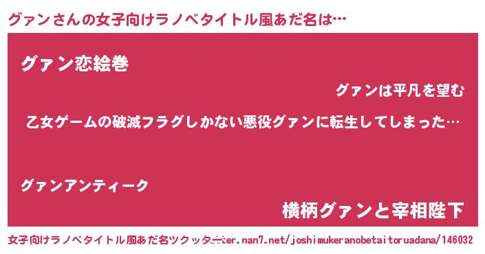 | 男性向けラノベタイトル風あだ名 | 『魔弾の王とグァン』 |