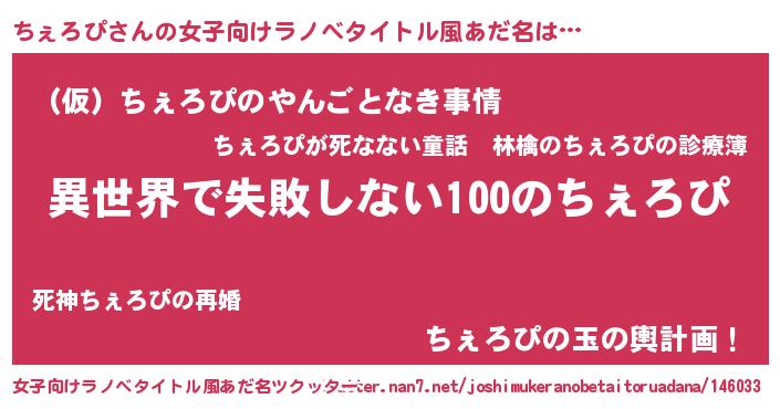 | 男性向けラノベタイトル風あだ名 | 『ちぇろぴという概念が存在しない退屈な世界 』 |