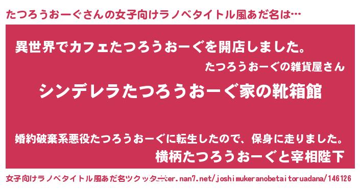 | 胡散臭い通販商品みたいなあだ名 | 『絶対に幸福をもたらす健康食品…その名も「たつろうおーぐ」』 |