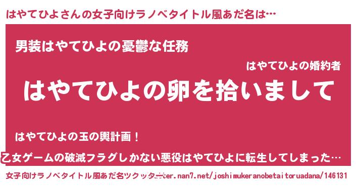 | 男性向けラノベタイトル風あだ名 | 『ダンジョンにはやてひよを求めるのは間違っているだろうか』 |