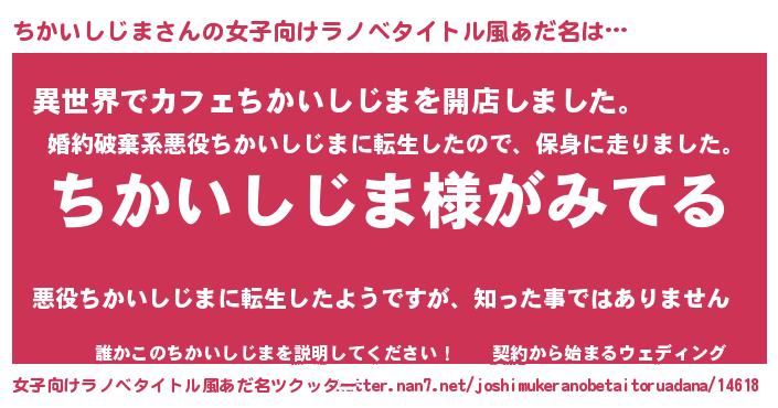 ちかいしじまさんの女子向けラノベタイトル風あだ名は… 『ちかいしじま様がみてる』『異世界でカフェちかいしじまを開店しました。』『誰かこのちかいしじまを説明してください! ~契約から始まるウェディング~』 ツクッター #女子向けラノベタイトル風あだ名ツクッター http://tkutter.nan7.net/joshimukeranobetaitoruadana/14618/