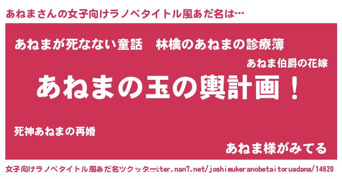 | 胡散臭い通販商品みたいなあだ名 | 『あなたにだけ特別に提供する100年もののヴィンテージワイン…その名も「あねま」』 |