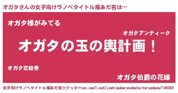 | 男性向けラノベタイトル風あだ名 | 『オガタ~年齢イコール彼女いない歴の魔法使い~』 |
