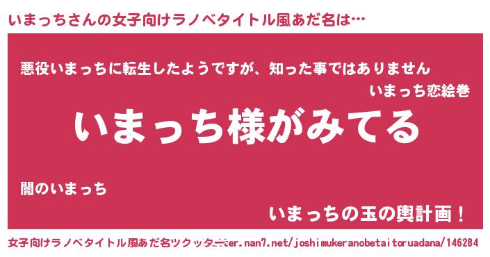 | 男性向けラノベタイトル風あだ名 | 『いまっちの嫁は女の子じゃないと思った?』 |