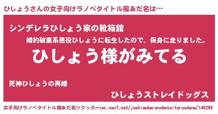ひしょうさんの女子向けラノベタイトル風あだ名は… 『ひしょう様がみてる』『シンデレラひしょう家の靴箱館』『ひしょうストレイドッグス』 ツクッター #女子向けラノベタイトル風あだ名ツクッター http://tkutter.nan7.net/joshimukeranobetaitoruadana/146286/