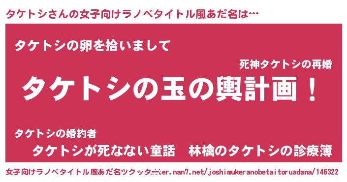 | 男性向けラノベタイトル風あだ名 | 『タケトシ~年齢イコール彼女いない歴の魔法使い~』 |