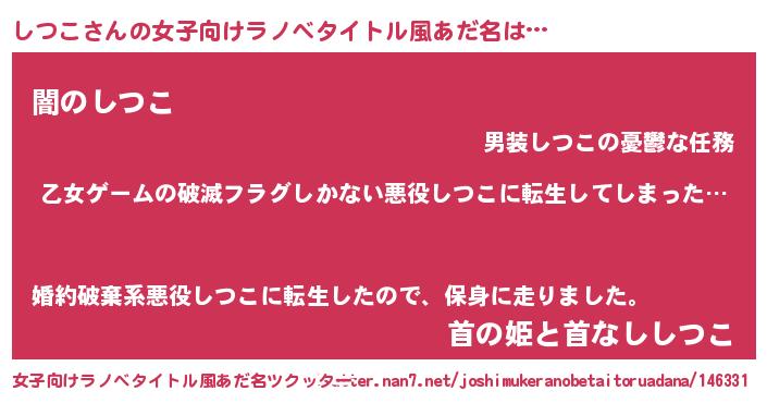 男性向けラノベタイトル風あだ名 | 『この素晴らしい世界にしつこを!』 |