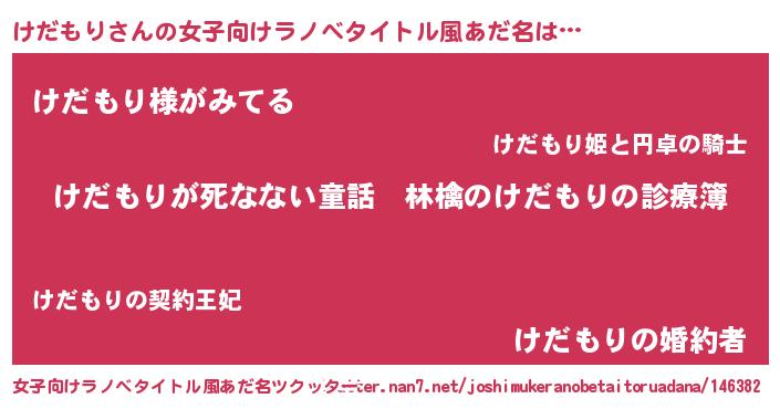 | 男性向けラノベタイトル風あだ名 | 『魔弾の王とけだもり』『けだもりの憂鬱』 |