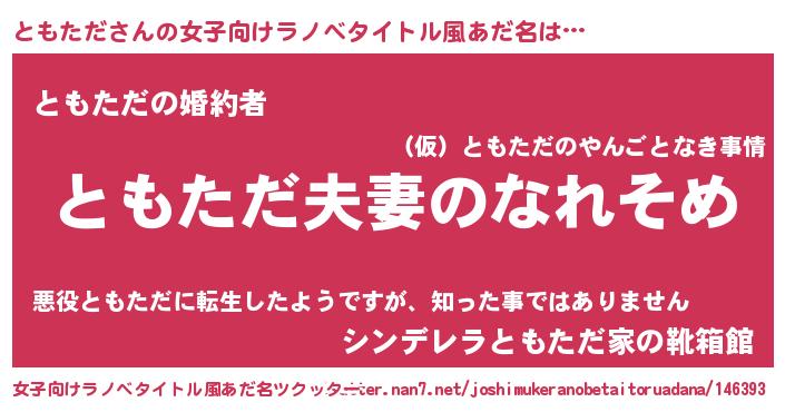 | 男性向けラノベタイトル風あだ名 | 『おまえをオタクにしてやるから、俺をともただにしてくれ! 』 |