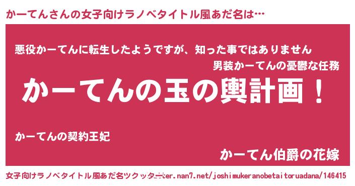 | 男性向けラノベタイトル風あだ名 | 『転生したらかーてんだった件』 |