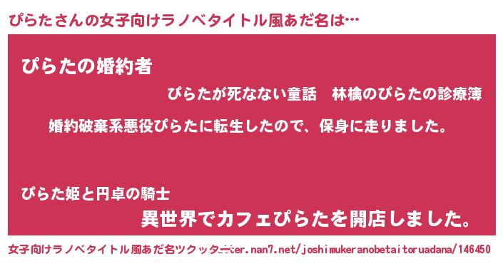 | 男性向けラノベタイトル風あだ名 | 『ピラタスレイヤー』『魔弾の王とぴらた』 |