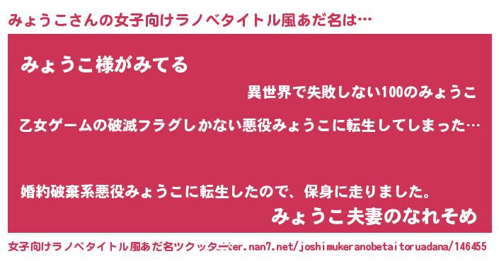| 男性向けラノベタイトル風あだ名 | 『魔弾の王とみょうこ』 |