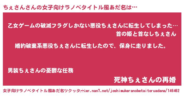 | 男性向けラノベタイトル風あだ名 | 『転生したらちぇさんだった件』 |