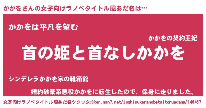 | 男性向けラノベタイトル風あだ名 | 『はたらくかかをさま!』『緋弾のカカヲ』 |