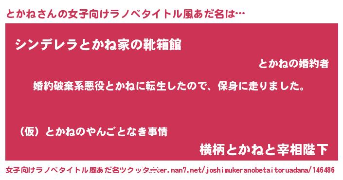 男性向けラノベタイトル風あだ名 | 『トカネスレイヤー』『とかねの憂鬱』 |