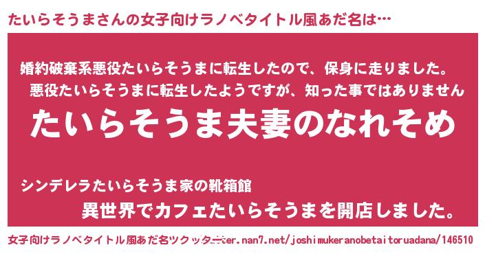 | 男性向けラノベタイトル風あだ名 | 『おまえをオタクにしてやるから、俺をたいらそうまにしてくれ! 』 |