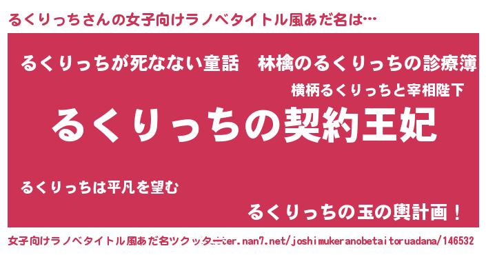 るくりっちさんの女子向けラノベタイトル風あだ名は… 『るくりっちの契約王妃』『るくりっちが死なない童話 林檎のるくりっちの診療簿』『るくりっちの玉の輿計画!』 ツクッター #女子向けラノベタイトル風あだ名ツクッター http://tkutter.nan7.net/joshimukeranobetaitoruadana/146532/