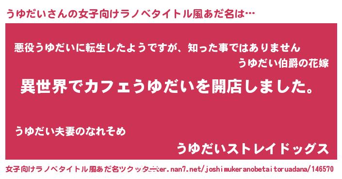 | 胡散臭い通販商品みたいなあだ名 | 『前代未聞の水素水…その名も「うゆだい」』 |