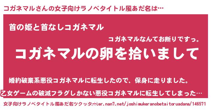 | 男性向けラノベタイトル風あだ名 | 『コガネマルの嫁は女の子じゃないと思った?』 |