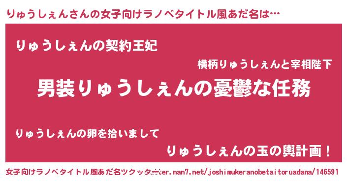 | 男性向けラノベタイトル風あだ名 | 『うちのりゅうしぇんが世界を掌握している!』 |