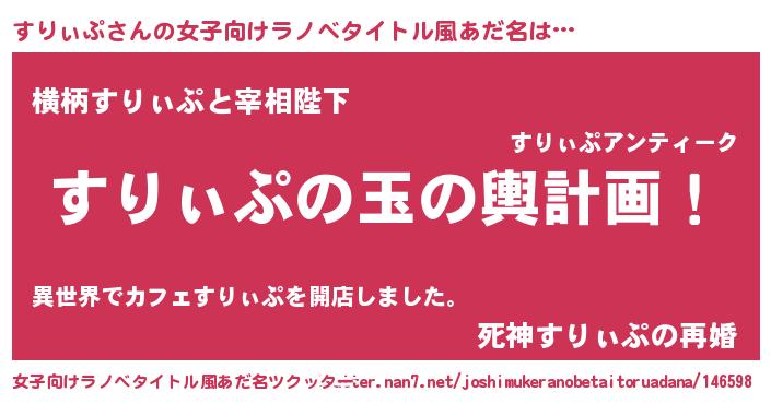 | 男性向けラノベタイトル風あだ名 | 『すりぃぷ~年齢イコール彼女いない歴の魔法使い~』 |
