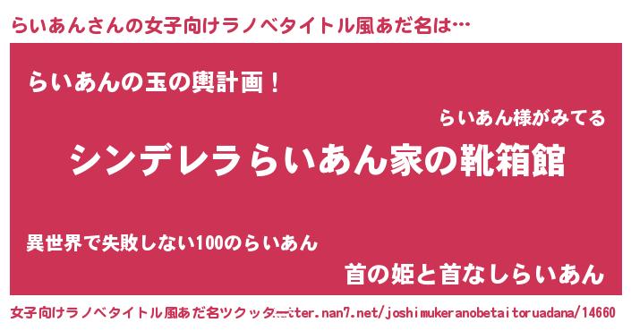 らいあんさんの女子向けラノベタイトル風あだ名は… 『シンデレラらいあん家の靴箱館』『らいあんの玉の輿計画!』『首の姫と首なしらいあん』 ツクッター #女子向けラノベタイトル風あだ名ツクッター http://tkutter.nan7.net/joshimukeranobetaitoruadana/14660/