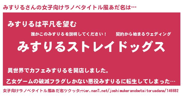 | 男性向けラノベタイトル風あだ名 | 『Re:みすりるから始める異世界生活』 |