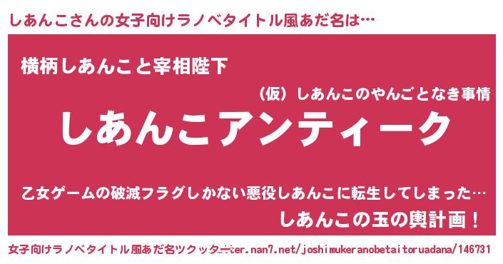 | 意味不明あだ名 | 『自称しあんこ』『つくし科しあんこ属』 |