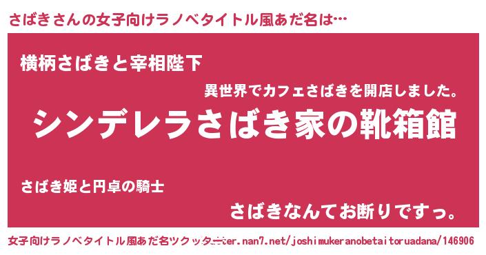 さばきさんの女子向けラノベタイトル風あだ名は… 『シンデレラさばき家の靴箱館』『横柄さばきと宰相陛下』『さばきなんてお断りですっ。』 ツクッター #女子向けラノベタイトル風あだ名ツクッター http://tkutter.nan7.net/joshimukeranobetaitoruadana/146906/