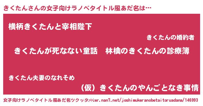 | 男性向けラノベタイトル風あだ名 | 『魔弾の王ときくたん』『きくたんの憂鬱』 |