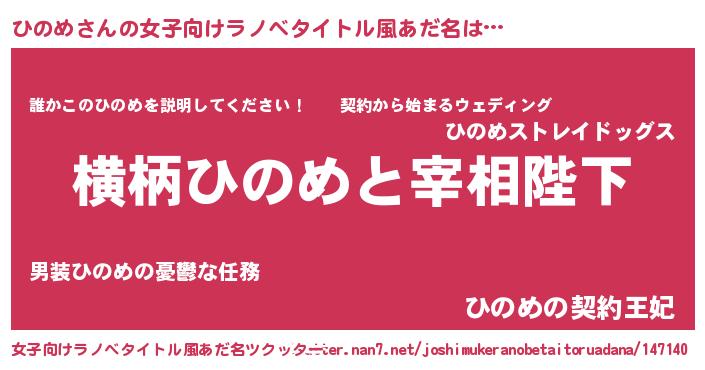 | 男性向けラノベタイトル風あだ名 | 『ひのめに滅ぼされるだけの簡単なお仕事です』 |