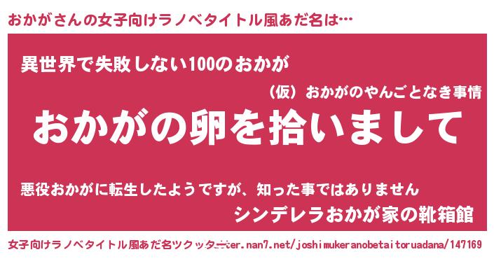 | 男性向けラノベタイトル風あだ名 | 『ダンジョンにおかがを求めるのは間違っているだろうか』 |