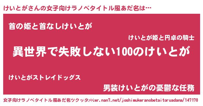 | 胡散臭い通販商品みたいなあだ名 | 『絶対に幸福をもたらす水素水…その名も「けいとが」』 |